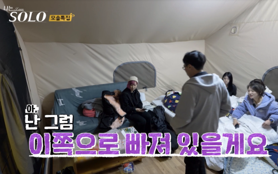 광수는 자기는 빠져있겠다며 자리를 옮기더니 급기야는 영철만 남겨두고 아예 남자쪽 텐트로 나가버립니다.