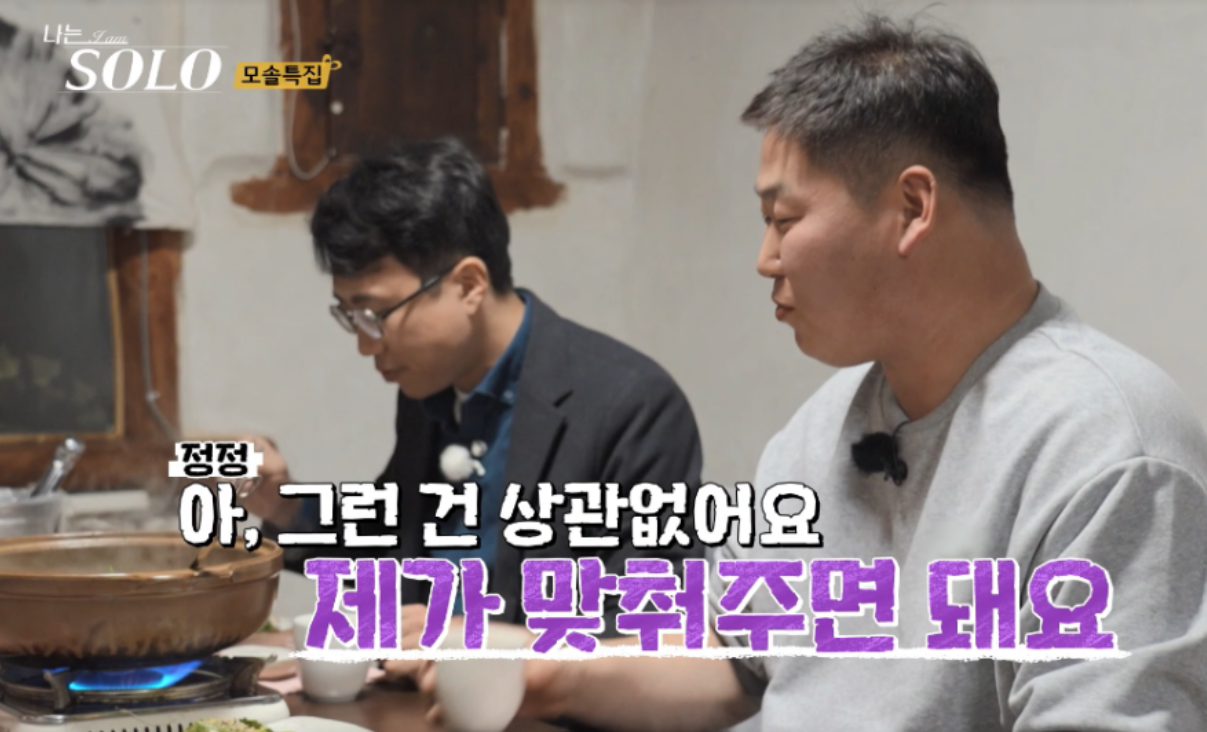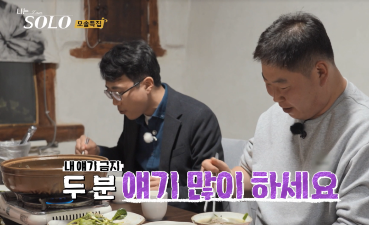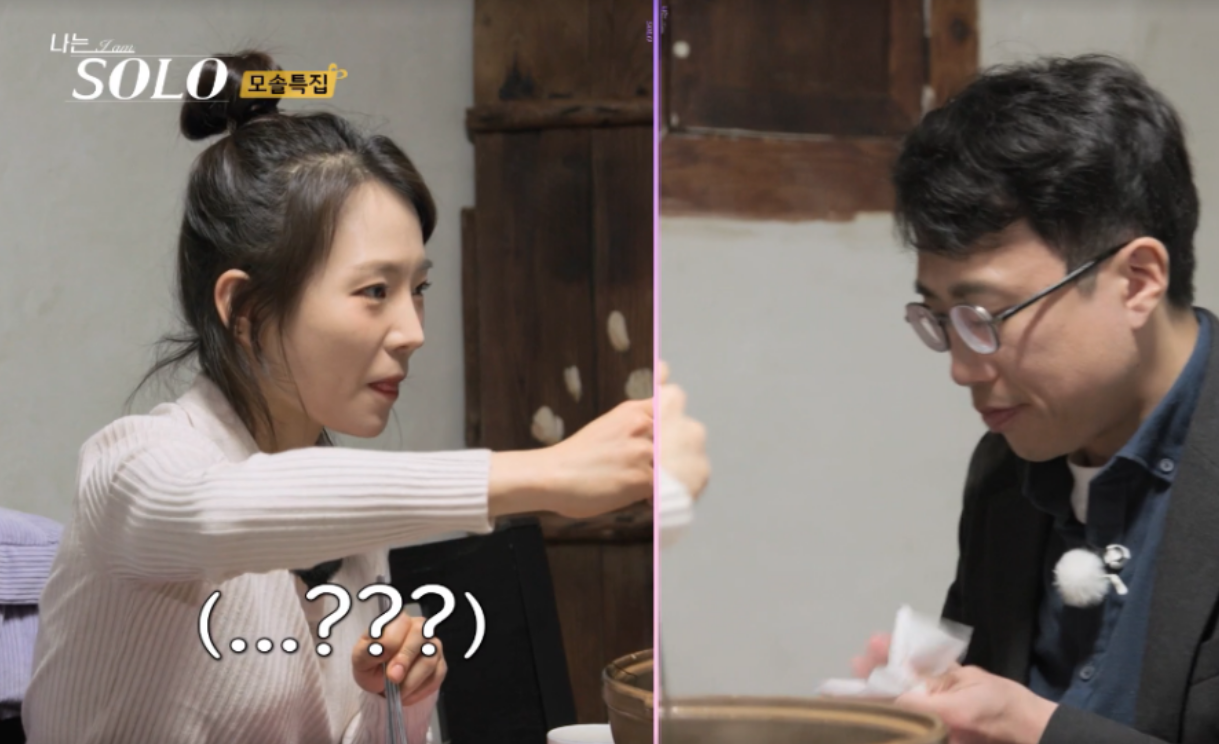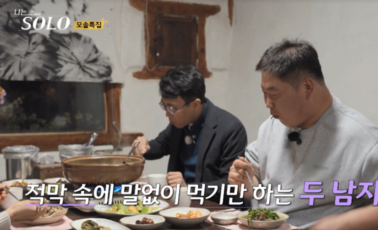 저녁 메뉴인 오리백숙이 나왔는데 다들 그냥 먹방모드입니다. 맛있다는 말아라도 하고 많이 먹으라는 말이라도 할법한데, 둘 다 사회성은 제로인듯합니다. 결국 영숙이 나서서 말을 걸어봅니다. 배 많이 고팠냐고 물어도 자기가 맞춰주면 된다는 어이없는 답을 하는 광수... 어쩔...