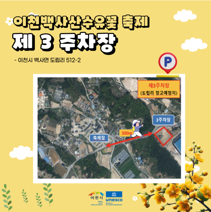 2024 이천백사 산수유꽃축제는 지난해에 비해 더 많은 주차장을 준비했다고 합니다.