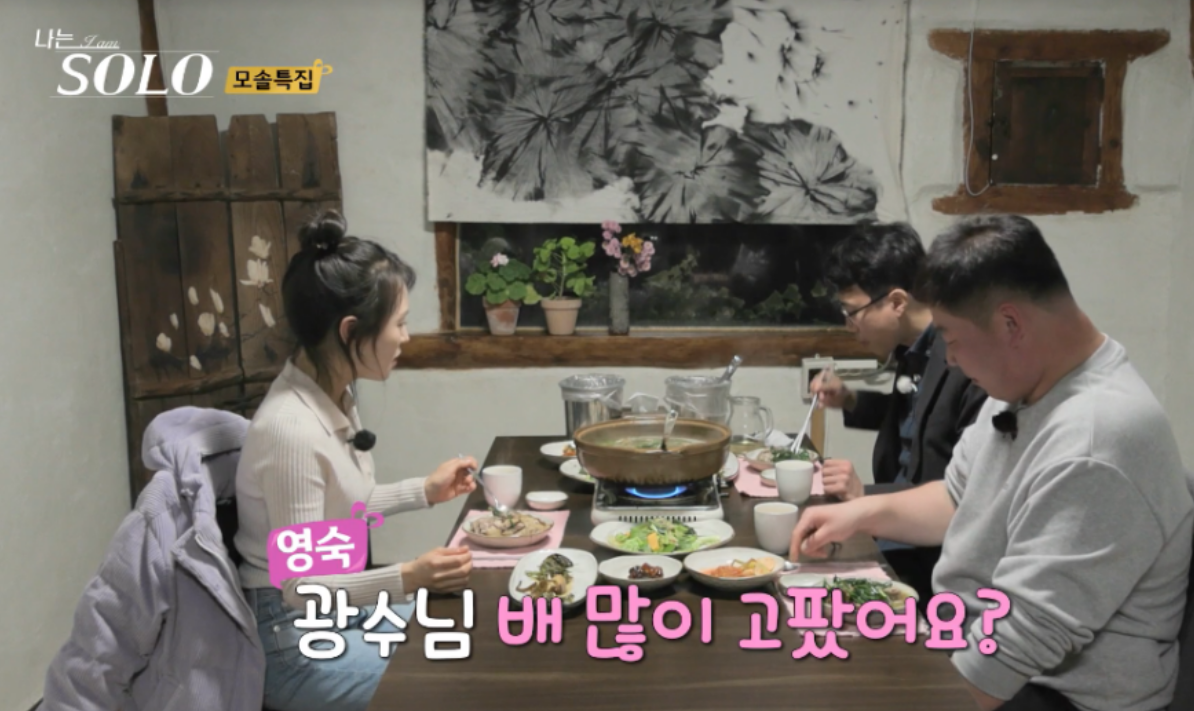 저녁 메뉴인 오리백숙이 나왔는데 다들 그냥 먹방모드입니다. 맛있다는 말아라도 하고 많이 먹으라는 말이라도 할법한데, 둘 다 사회성은 제로인듯합니다. 결국 영숙이 나서서 말을 걸어봅니다. 배 많이 고팠냐고 물어도 자기가 맞춰주면 된다는 어이없는 답을 하는 광수... 어쩔...