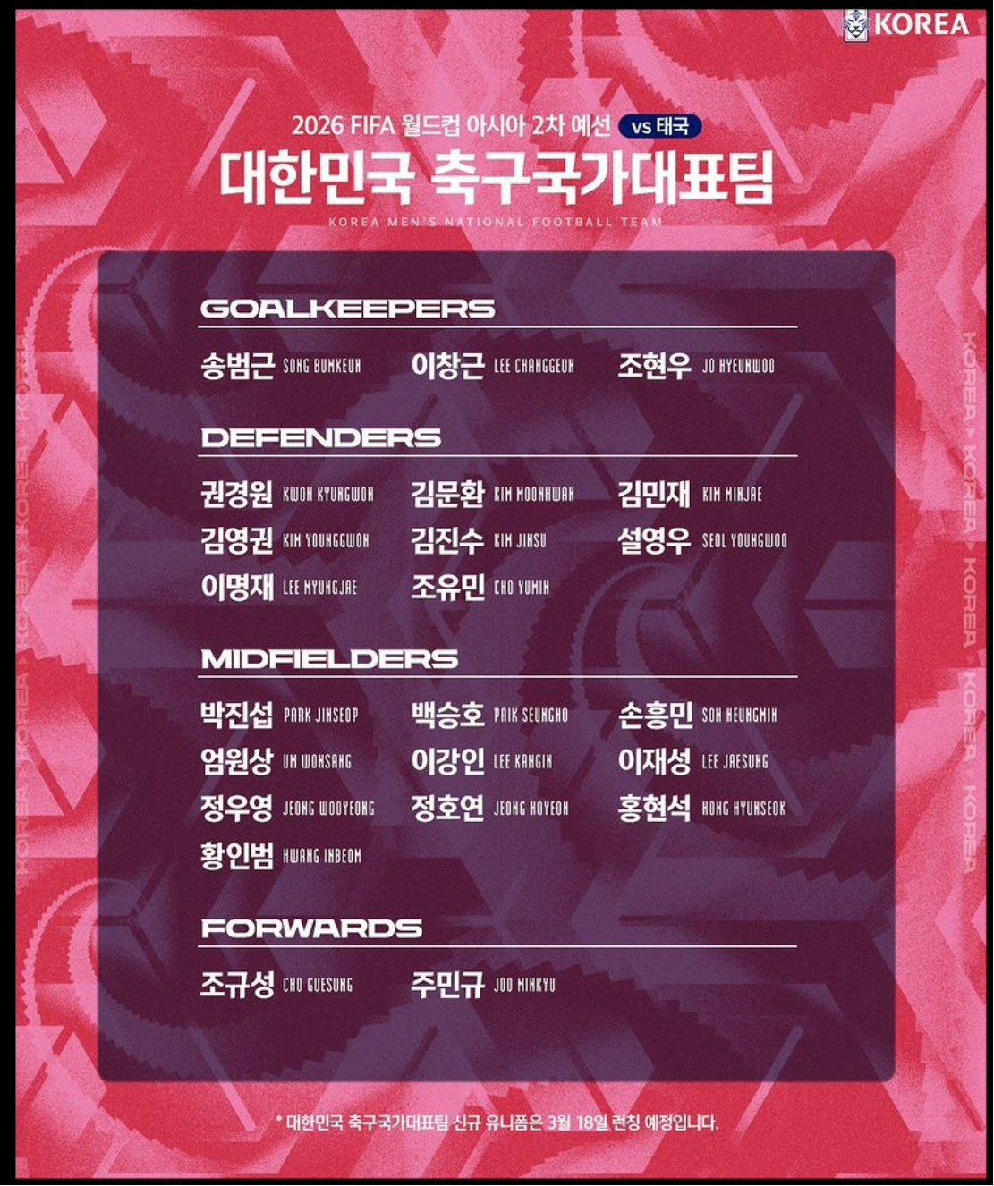 | 골키퍼 | 조현우(울산), 송범근(쇼난벨마레), 이창근(대전) |
