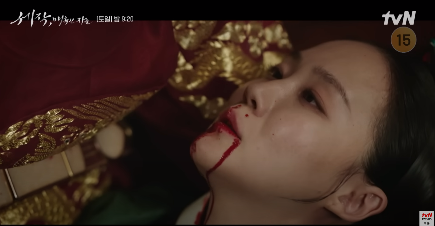 미리 독을 입에 품은채 임금 이인 앞에서 자결을 하고 마는 동상궁..