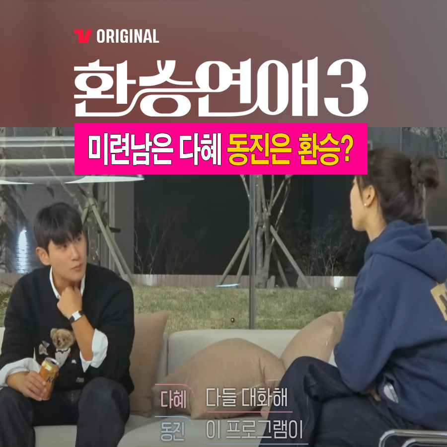이어 두 사람의 대화 시간이 마련되고, 다혜는 "다들 대화해"라고 말했지만 동진은 "이 프로그램이 환승연애지 재회연애가 아니잖아?라고 일침합니다. 다혜는 "재회를 할 수도 있는 선택도 있는 거잖아"라며 미련을 버리지 속내를 내비치고 맙니다.